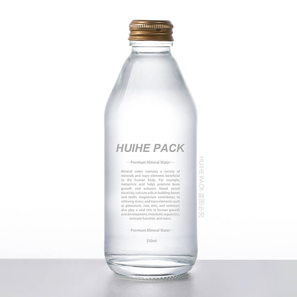 Diese 250-ml-Glaswasserflasche hat eine klare, stromlinienförmige zylindrische Form: Sie ist 158 mm hoch und hat einen Bodendurchmesser von 58,3 mm. Sie verfügt über glatte, gerade Seiten und kristallklares Glas, das für einen eleganten, modernen Look sorgt – perfekt für High-End-Mineralwassermarken, die eine minimalistische Premium-Verpackung anstreben.