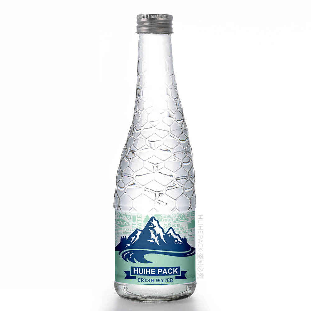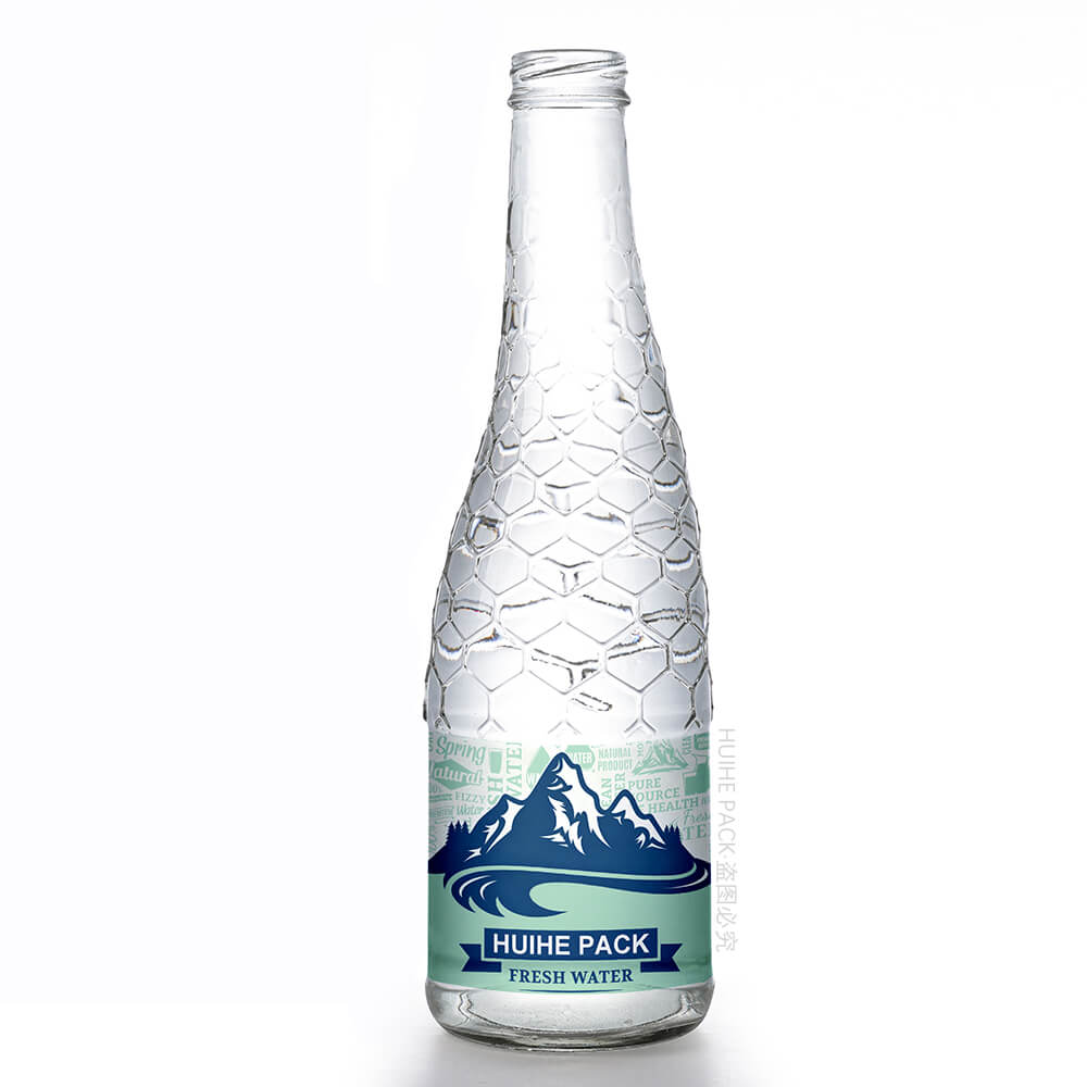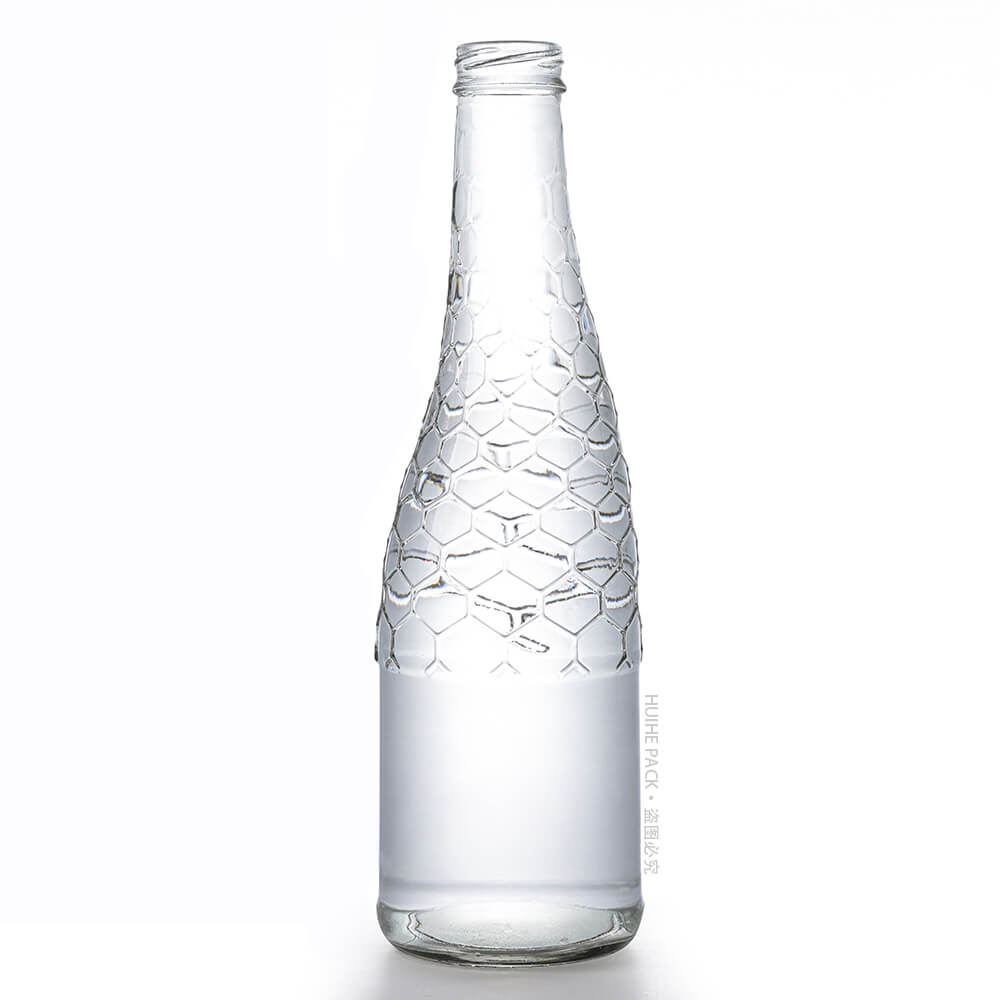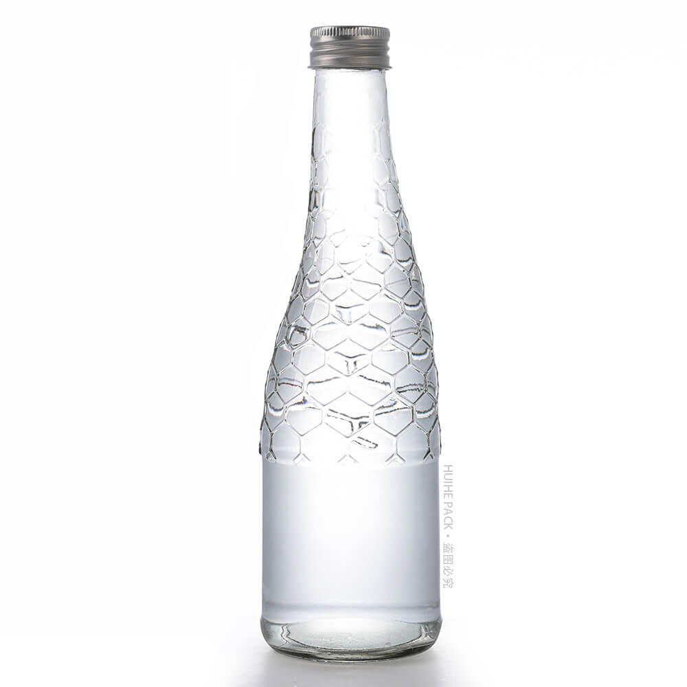 Diese 330-ml-Glaswasserflasche verfügt über ein einzigartiges, auffälliges Design: Sie ist 223 mm hoch und hat einen Bodendurchmesser von 65 mm. Sie verfügt über eine konische Form, gepaart mit einem strukturierten Wabenmuster auf der oberen Hälfte und einem mattierten unteren Teil – diese Mischung aus Details verleiht ihr einen luxuriösen, unverwechselbaren Look, perfekt für hochwertige Mineralwassermarken, die auffallen möchten.