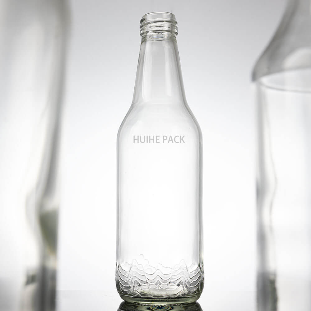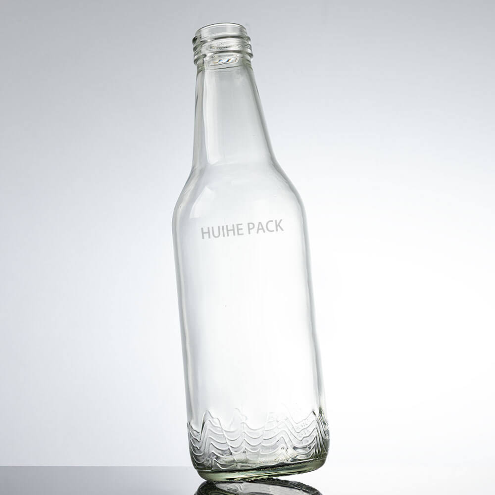 Diese Premium-Wasserflasche aus Glas fasst 380 ml, ist 202 mm hoch und hat eine Körperbreite von 59 mm. Es zeichnet sich durch eine schlanke, sich verjüngende Form aus: Ein schmaler Hals mit Gewinde erweitert sich sanft zu einem schlanken Körper, der an der Basis mit einem strukturierten Wellenmuster versehen ist, das für einen subtilen optischen Reiz sorgt. Sein klares, hochtransparentes Glas präsentiert den Inhalt lebendig und macht es ideal für hochwertige Mineralwassermarken und Premiumgetränke.