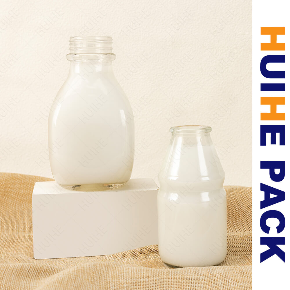 Diese Milchflasche aus Glas (mit einer klassischen Krugform) verfügt über einen konischen Hals, der sich zu einem vollen, strukturierten Körper erweitert, gepaart mit klarem Glas, das den Inhalt deutlich hervorhebt. Es passt zu verschiedenen Milchprodukten und Getränken.