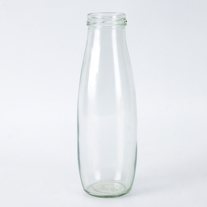 Diese Milchflasche aus Glas zeichnet sich durch eine schlanke, geschwungene Silhouette aus: Ein schmaler Hals mit Gewinde geht in einen sich sanft verjüngenden Körper über, der sich am Boden leicht erweitert, gepaart mit klarem Glas, das den Inhalt klar anzeigt. Es passt zu verschiedenen Milchprodukten und Getränken.