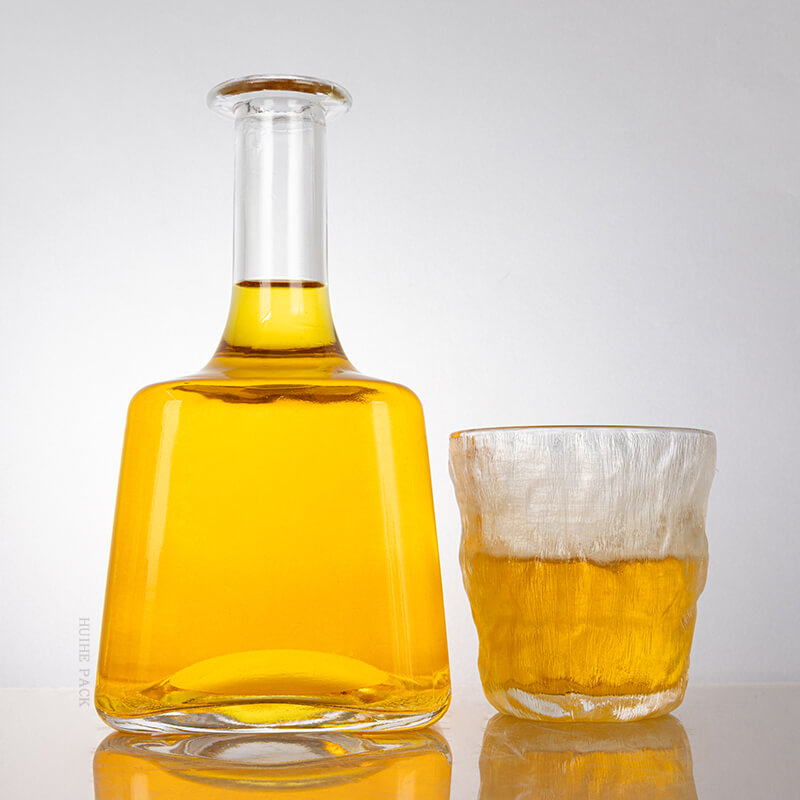 Der Flaschenhals ist groß und schlank und steigt anmutig von der Oberseite des Trapezkörpers auf. Es hat einen glatten, nahtlosen Übergang, der zu einer kleinen, kreisförmigen Öffnung führt, die sich perfekt zum Gießen und Anpassung eines Stoppers eignet. Die insgesamt Silhouette der Flasche ist elegant und raffiniert, was es zu einer herausragenden Wahl für Premium -Spirituosen macht. Wenn Sie auf der Suche nach 'modernen Glasflaschenflaschen ' sind, um Ihre Marke zu erhöhen, passt dieses Design hervorragend.