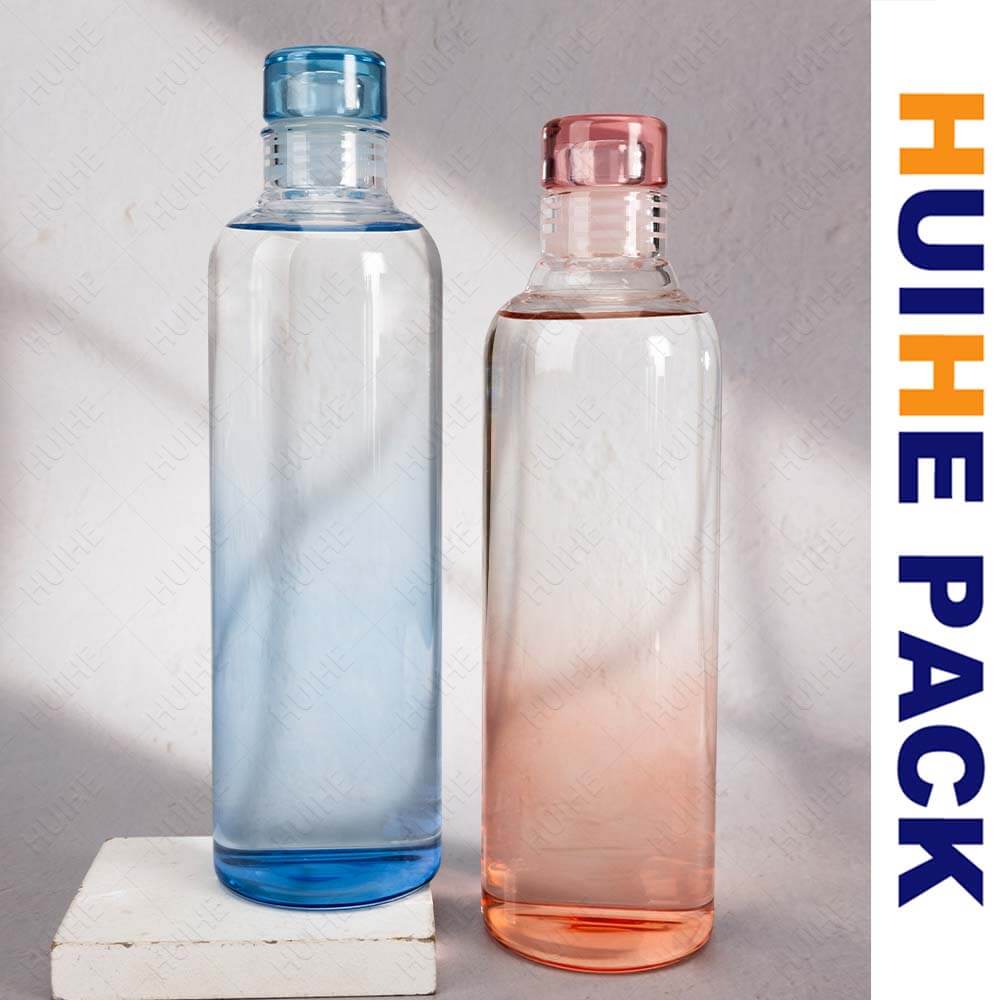 Diese Wasserflasche aus Borosilikatglas hat eine schlanke, längliche zylindrische Form und ist in Farbverlaufsausführungen (klar, blau, pfirsich, dunkelgrau) erhältlich, die einen modernen, stilvollen Touch verleihen. Der glatte Hals sorgt in Kombination mit einer passenden getönten Kappe für einen stimmigen Look.